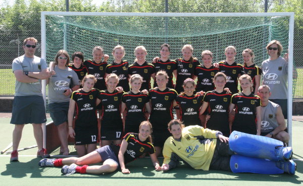 Das deutsche Team während des DFJW-Lehrgangs über Pfingsten in Köln. Von links, hinten: Co-Trainer Sven Lindemann, Teammanagerin Nina Lemmen, Maxi Pohl, Caroline Schnitzer, Roda Müller-Wieland, Pia Grambusch, Viktoria Wieske, Mona Frommhold, Janine Sasserath, Carolin Wolf, Helena Faust, Bundestrainerin Lisa Jacobi; vorne: Tonja Fabig, Sabrina Schützenhofer, Nina Laudahn, Petra Ankenbrand, Lara Kruggel, Lena Andersch, Katrin Bremer, Physio Det Mehn;